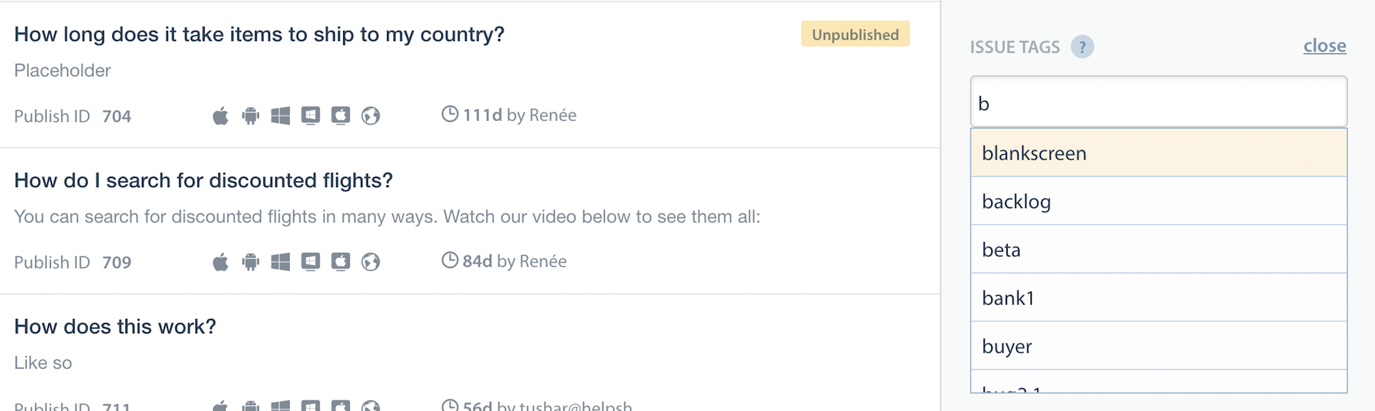 - FAQs need to be classified using the issue tags field on the dashboard e.g. tags ‘phone’ & ‘tablet’.