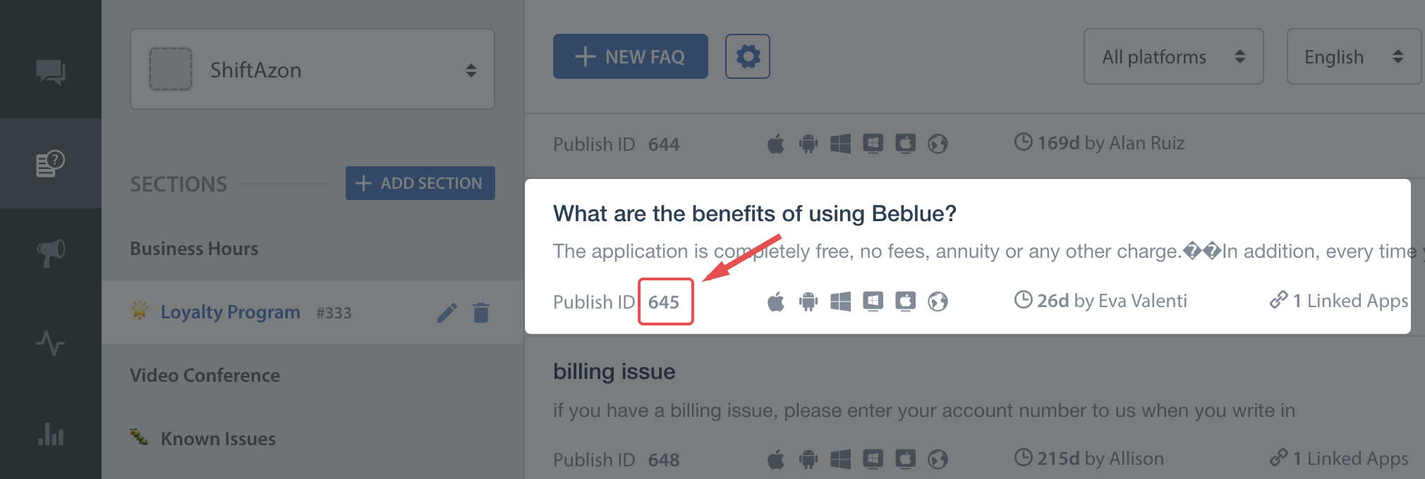 This feature works like a permalink for displaying specific FAQ sections as context sensitive help in your app. For example, if your app requires the user to login to using email, facebook and twitter, you could wire a help action on the login screen that can link to the Helpshift FAQ section called "Login help" which has several questions related to login methods.