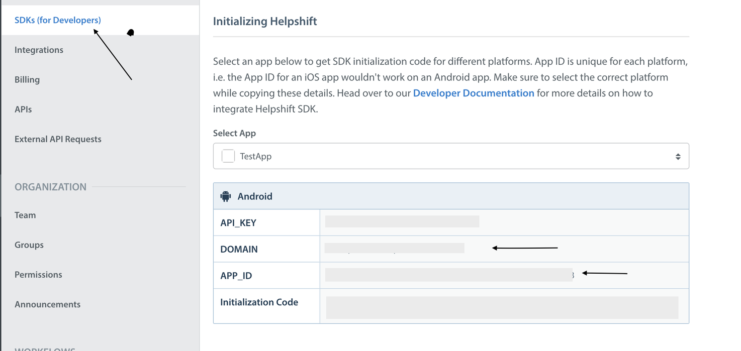 You can find these by navigating to Settings>SDKs (for Developers) in your agent dashboard. Select your App and check Android and iOS as a platform from the dropdowns and copy the 2 tokens to be passed when initializing Helpshift.