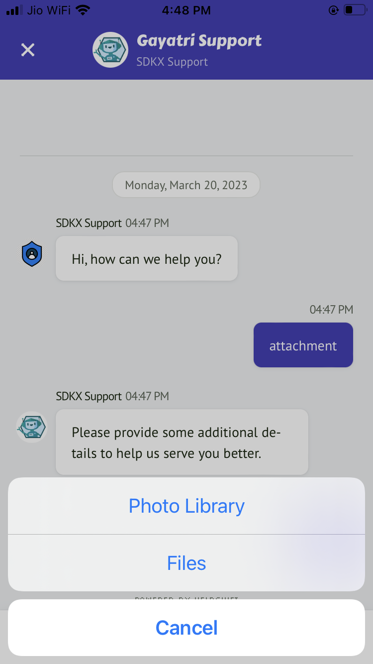 When the “User Attachments” feature is enabled from the In-app SDK Configuration section, the SDK allows the user to upload the attachments. The attachments can be picked up from the Photo Library or Files. The options for these sources look like: