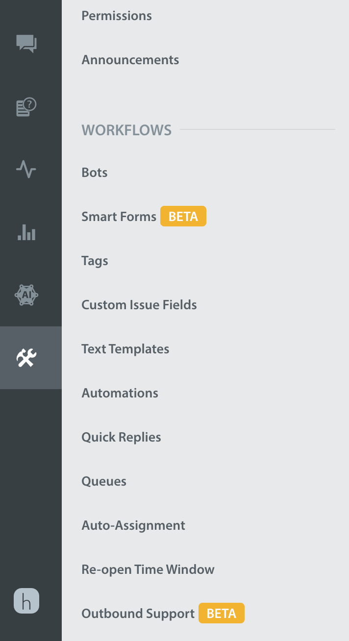 To generate the link for outbound support, on your Helpshift dashboard, go to Settings > Workflows > Outbound Support.